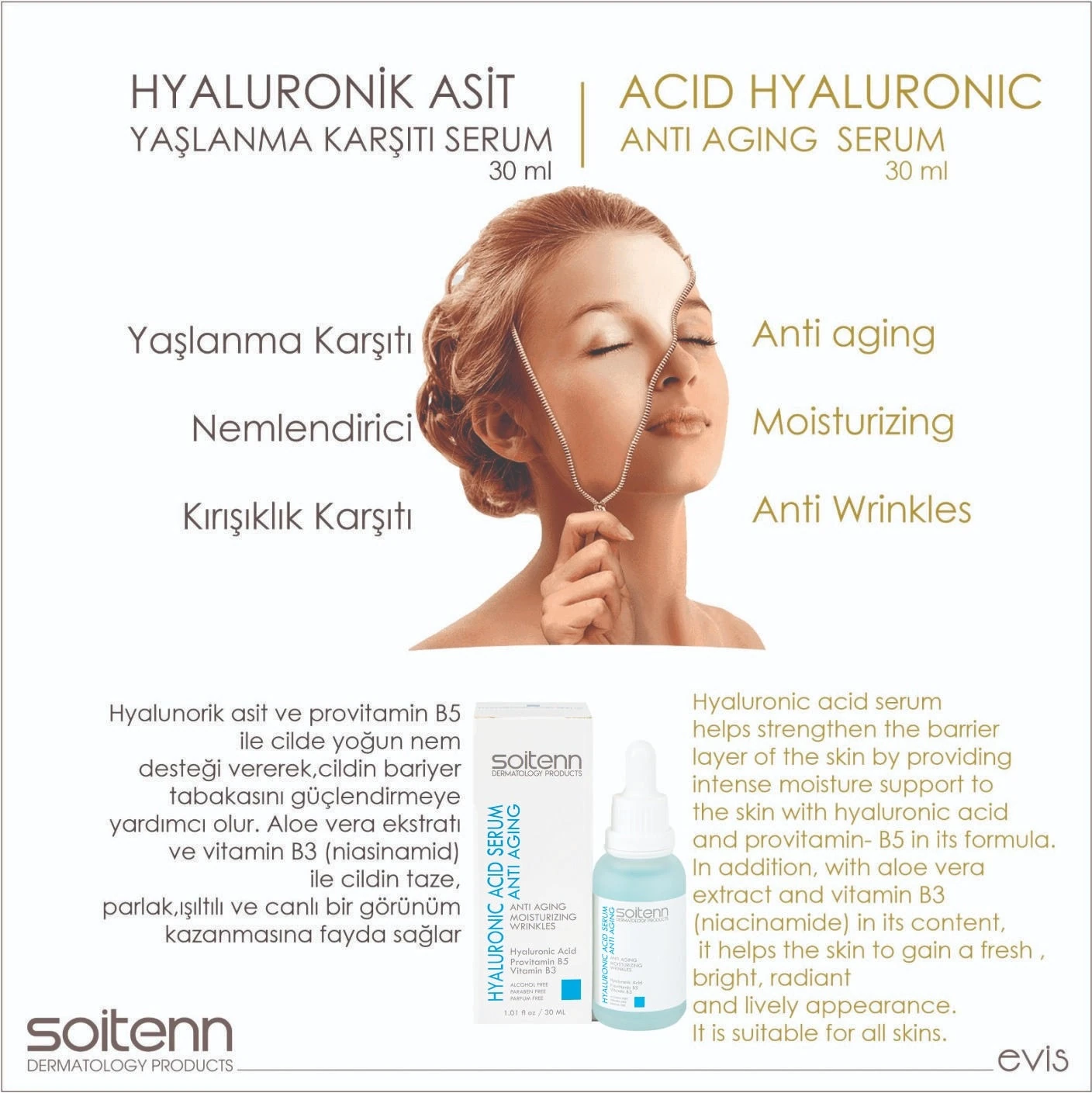 Soitenn Hyaluronic Acid Serum, formülündeki hyaluronik asit ve Provitamin-B5 ile cilde yoğun nem desteği vererek, cildin bariyer tabakasını güçlendirmeye yardımcı olur. Ayrıca içeriğinde yer alan aloe vera ekstraktı ve vitamin B3 (niasinamid) ile cildin taze, parlak, ışıltılı ve canlı bir görünüm kazanmasına fayda sağlar. Bütün cilt tipleri için uygundur.